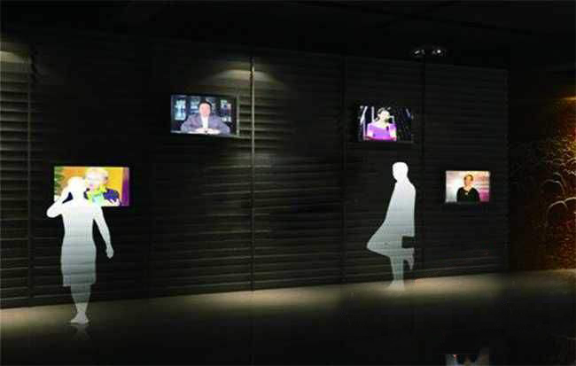 觀眾看到墻面上多個顯示設(shè)備中,每個顯示畫面中都有人物的視頻靜止影像。每臺電視下都有一個控制按鈕(可以是自動感應(yīng)器),當觀眾按到其中一個時(當自動感應(yīng)器撲捉有人接近 ……